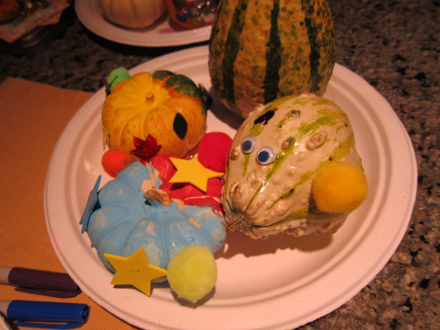 And this is all Clover's doing. She was particularly into this craft project (I can't say I blame her). The best one, in my opinion is that small orange and green gourd that looks like a hedgehog. Awesome.